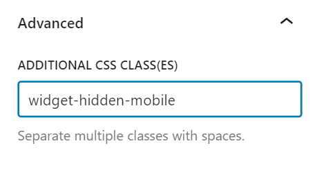 Use the widget-hidden-desktop and widget-hidden-mobile classes to hide specific blocks on various devices